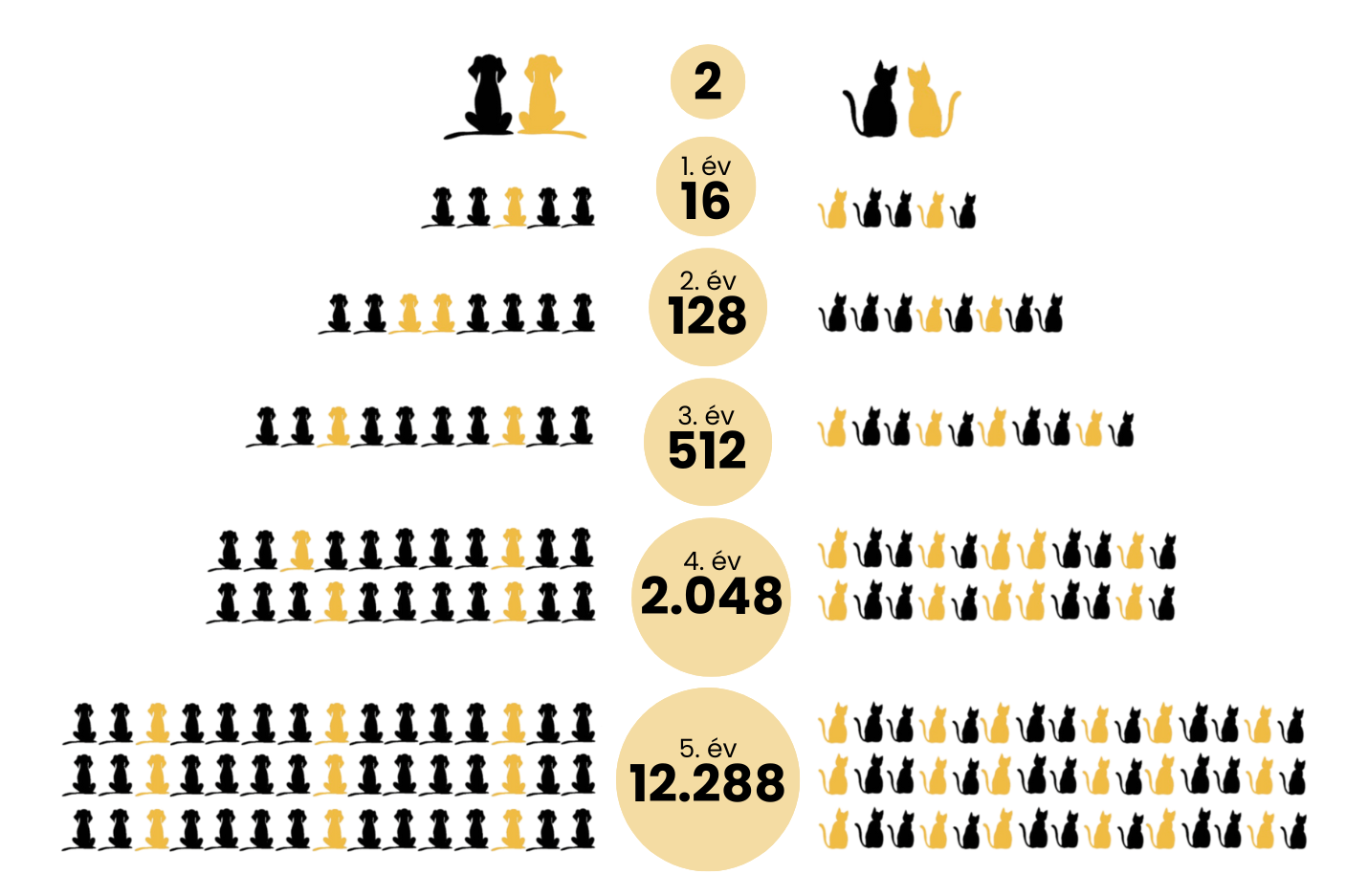 Egy nőstény ivarú kutyának vagy macskának évente két-három alkalommal átlagosan 5-8 kölyke születhet. A nemzetközi számítások általában 5 kölyökkel számolnak vemhességenként. Mindkét faj már a 4-6 hónapos kortól ivaréretté válhat. Így akár 5 éven belül 12 ezer utódot is létrehozhat. Az is általános probléma, hogy míg korábban tavaszi és őszi párzási hullám volt megfigyelhető, addig napjainkban már teljes évre kiterjed az ivarzás folyamata. Egész évben folyamatossá vált a vemhesülés és az új almok létrejötte.
